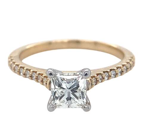 Made with all Natural Diamonds Material: 14k White and Yellow Gold Total Weight: 1.11ctw Center Stone: 1.00ct Accent Stone(s): 18=0.11ctw Clarity: VS2 Colour: G