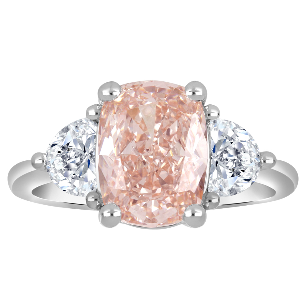 Material: 14k White Canadian Gold Total Weight: 3.60ctw Center Stone: Pink Cushion Cut 3.00ct Accent Stone(s): 2 Half Moon=0.60ctw Clarity: VS2 Colour: F